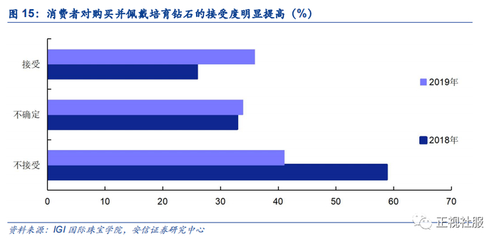 消费者对购买并佩戴培育钻石的接受度明显提高。根据 IGI 对消费者的调研,2018 年受调研 消费者中 59%不接受培育钻石,接受者比例只有 26%;而到了 2019 年,接受者的比例提升 提升至 36%,不接受者的比例则下滑至 41%。培育钻石市场规模的扩大、品牌商的教育以 及消费者对培育钻石的态势三者间实现了良性循环,预计未来消费者对培育钻石的接受度会继续提升。