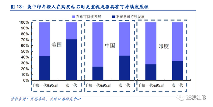 优势二:培育钻石形成过程中更环保,受年轻消费者欢迎。根据Frost & Sullivan发布的《毛坯金刚石生产的环境影响分析》,开采钻石产生的有害碳排放量为每克拉57000克,而培育钻石每克拉仅释放0.028克。此外,获取一克拉天然钻石需要毁坏多达1750吨无法修复、且长期不能耕种的土壤,而培育钻石对环境造成的破坏为0,更符合可持续发展理念。根据贝恩咨询,在中美消费者中,年轻消费者更加重视产品的可持续性特点,美中印三国千禧及Z世代人群中分别有58%、76%、72%的比例在购买钻石时会关心这一特点,而在年长人群中这一比例分别为29%、57%、66%。