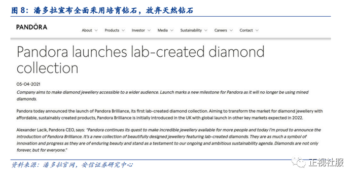 潘多拉宣布弃用天然钻石,转而全面使用培育钻石。全球知名珠宝商潘多拉在2021年5月4日宣布,为了保护环境,公司将全面采用人工钻石,不再出售天然开采的钻石,并计划在英国发布第一批使用实验室制造钻石的珠宝系列,并在2022年扩大到其他市场,该系列的戒指、手镯和耳环将采用0.15至1克拉的钻石。公司把可持续发展视为品牌优势,并向消费者灌输绿色低碳理念。潘多拉官网宣称,培育钻石与天共开采的钻石是一样的,它们只是在实验室里生长,而不是从矿井里挖出来,两者具有相同的光学、化学、热和物理属性。