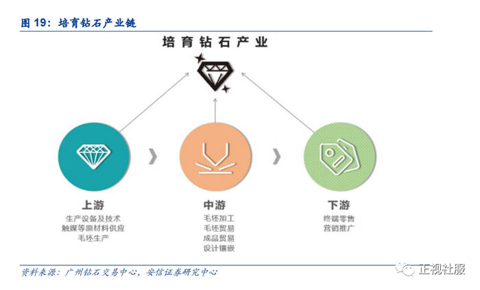 培育钻石的培育过程需要先对钻石毛胚进行生产,即未经加工的钻石晶体,一般通过HPHT或CVD法对晶种进行处理,在晶种表面不断沉积生成钻石晶体,生成的钻石毛胚还需根据终端需要送去加工厂经过设计、切割、打磨、抛光等工序,最后送至下游零售终端进行销售。我国在上游毛胚钻石生产环节占比较高,贡献了40%~50%培育钻石产能,未来上游将优先受益培育钻石需求增长。