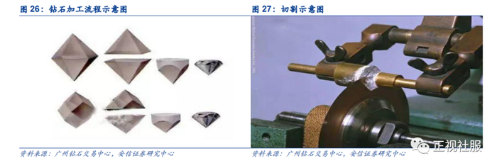 钻石加工即在钻石毛胚上进行切割、磨光等多个步骤,使其形成一定的形状以及光泽,主要加工流程可以分为:原石分选、划线、劈裂、锯割、打圆、起瓣、磨光等。
