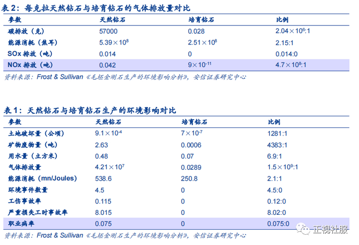 ■培育钻石性价比优势突出,行业接受度、规范性日渐增强。培育钻石是在实验室内模拟天然钻石生长环境而成的合成钻石,合成培育钻石的方法主要有HPHT高压高温法和CVD化学气相沉积法,培育时间约为半个月至一个月。培育钻石在物理、化学、光学性质上实现与天然钻石完全一致,具有生产过程简单、环保(据Frost&Sullivan报告,开采钻石产生的有害碳排放量为每克拉57000克,培育钻石每克拉仅释放0.028克)、价格便宜(约为天然钻石的30%,定位轻奢)、样式多变等优点。最早的培育钻石创造自1952年,经过50~60年的发展,于近几年才得到行业的广泛关注,国内外权威珠宝鉴定机构NGTC、IGI等在2019~20年陆续发布相关标准文件明确培育钻石的概念,也已经面向市场开放培育钻石检测业务,并可开具专用检测证书或分级报告等,为行业的规范发展提供健康引导。