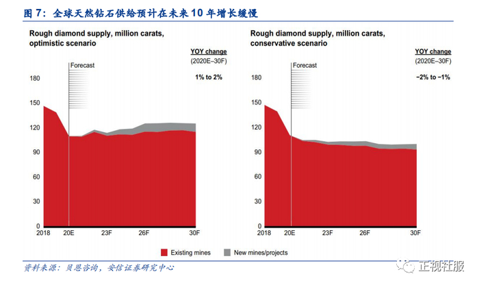 天然钻石供给端预计未来增长缓慢,不具有大幅扩产的可能。天然钻石矿产资源属于非可再生资源,全球天然钻矿产资源储量有限。根据戴比尔斯发布的《2019 钻石行业洞察报告》预测,到 2025 年将有 Argyle(2020 年)、 Victor(2019 年)、 Diavik(2025 年)、 Komsomolskaya(2021 年)等大型天然钻石矿山因达到使用寿命而关闭,由于新建或扩建项目未能弥补关闭矿山减少的天然钻石产量从而造成未来一段时间天然钻石产量将不断下 降。而根据贝恩发布的《2020-2021 钻石行业报告》,全球毛坯钻石产量在未来 10 年增长缓 慢,甚至出现下滑。在乐观情景下,2021-2030 全球毛坯钻石产量平均年增速为 1%-2%;而在悲观情境下,全球毛坯钻石产量平均每年下滑 2%到 1%之间。