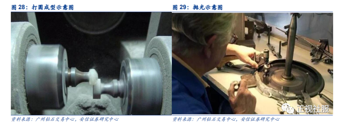 打圆成型:锯开的钻石送到打圆部门去打圆、成型。在这一步骤钻石就可以按照设计要求被打成圆形、心形、椭圆形、揽尖形等形状。一般是用金刚石聚晶或金刚石砂轮来进行打磨。因为钻石各个方向的硬度略有不同,所以研磨时要凭借经验,把握住钻石的基本形态:三方体、八面体、十二面体及晶体特性。一般方法是将钻坯高速旋转的车床上,然后用另一臂杆上的钻石把转动中的钻坯打圆。