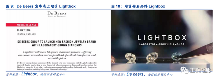 最大钻石供应商 De beers 态度转变,并推出了合成钻石品牌 Lightbox。De beers曾在2015年联合6家世界级钻石公司成立钻石生产商协会(DPA),坚定拥护天然钻石。然而在2018年其转变对合成钻石的态度,成立培育钻石珠宝品牌Lightbox,该品牌将是De beers旗下唯一使用其子公司Element Six钻石实验室提供的技术使用合成钻石的珠宝品牌。Lightbox在官网首页开设了“LEARN”专栏,在专栏内解释了“合成钻石是什么?”、“他们是如何制造的”、“实验室培育方法”等内容,努力打造培育钻石在消费者认知中的高端形象。根据Lightbox Ins官方披露,2020年底Lightbox开始积极扩大产能,该品牌位于美国俄勒冈州格雷沙姆的一家新制造工厂已正式投产,工厂建设耗资9400万美元,一旦全面运营,每年将生产约20万克拉的实验室培育的合成钻石,使其生产能力提高约10倍。