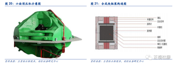 高温高压法(HPHT,High pressure-High temperature):其合成的基本原理是在人造的高温高压环境下,将石墨进行相转变生成钻石,一般需要10GPa、3000℃以上的压力和温度。如果有金属触媒(如Fe、Ni、Co、Mn等以及它们的合金)的参与,石墨相变为钻石所需要的条件将大幅降低,通常压力为5.4GPa,温度为1400℃。高温高压法制备过程中需要使用到的核心设备为六面顶压机、合成块和石墨芯柱等,其制备流程为: