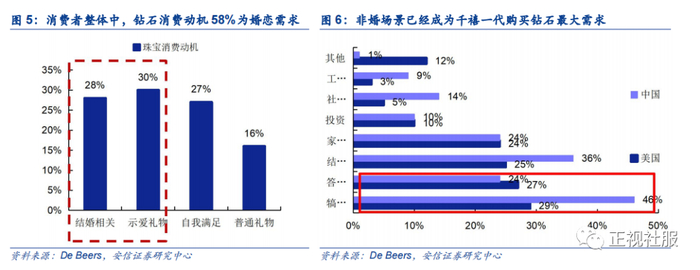 非婚场景扩容,未来钻石行业规模仍有提升空间。钻石消费分为婚恋需求和非婚恋需求,婚 恋需求向来占据钻石消费的最大比重部分。根据 De Beers,2019 年在消费者整体中,购买 钻石动机中有 28%为结婚相关,30%为示爱相关,婚恋合计占比达 30%。而在中美千禧一 代消费者中,购买钻石动机中,犒劳自己(中国/美国分别为 46%/29%)和答谢赠礼(中国/ 美国分别为 24%/27%)等非婚恋需求占比明显提升,非婚场景有望带动钻石消费频率的提 升,扩容钻石消费市场。