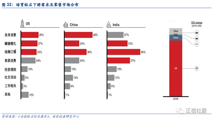 零售终端主要集中在美国,中国近年来逐渐进入零售终端。培育钻石的下游为零售终端以及相关的配套服务产业,根据《全球钻石行业报告》统计,下游消费需求中占比最大的分别为自身消费、酬谢赠礼、结婚订婚等需求,培育钻石作为钻石消费的新兴选择,由于其在品质、成本、环保和科技等方面优势明显,因此下游消费市场处于快速崛起状态。目前全球主要零售市场仍集中在美国,且占比较19年有大幅上升,第二大市场则为中国,尽管目前零售终端占比较小,但同比仍处于增长中,除此外的其他地区则基本同比持平,且市场规模较小。培育钻石零售企业一般为钻石珠宝零售商的旗下子公司,如全球最大钻石制造商De Beers旗下的Lightbox Jewelry,美国最大钻石零售商Signet 旗下的Kay、Jared、Zales等品牌。国内近年新进入品牌较多,如LightMark、Caraxy等,据统计目前美国已经拥有25个培育钻石品牌,中国则拥有19个,已仅次于美国,欧洲拥有9个,其他地区则较少。