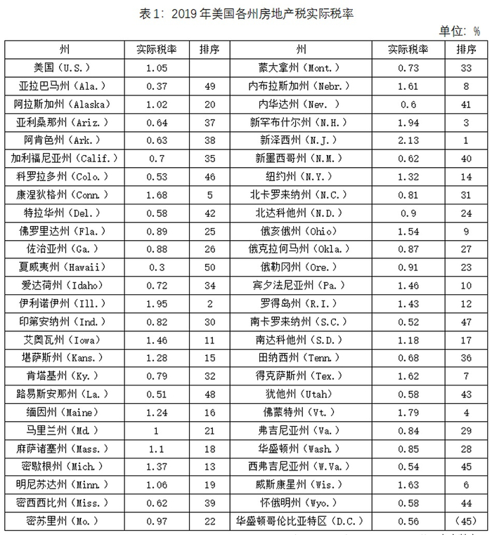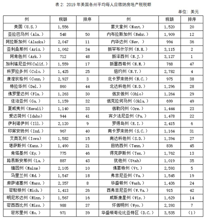资料来源:美国税收基金会(https://taxfoundation.org/state-tax/property-taxes/);华盛顿哥伦比亚特区(D.C.)不参与排名,“(1)”代表如果华盛顿哥伦比亚特区(D.C.)参与排名的话,其应有的排序。
