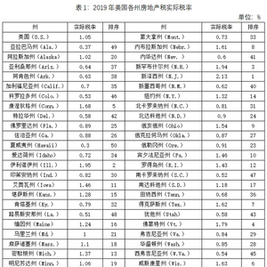 美国各州房地产税实际税率相差较大,如表1和图1所示,房地产税实际税率最高的是新泽西州(N.J.),为2.13%;最低的是夏威夷州(Hawaii),为0.3%,相差7倍以上。如表2和图2