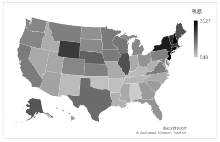 图2: 2019年各州平均每人应缴纳房地产税税额区域分布(单位:美元)