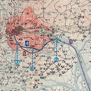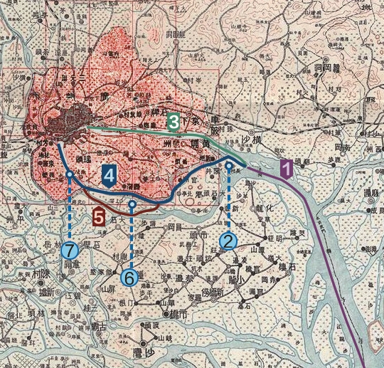 当年林则徐在加强虎门防御的同时,也为提升内河防御能力进行了筹划。他设想英军攻陷虎门后继续进军广州时,可能出现的情况:英舰进军线路只能经狮子洋(见图1中①)上溯,至长洲岛(见图1中②)一带就要面临选择了。因为从这里开始,珠江的主要水道自北至南分为三条:流经猎德的北航道,又称前航道(见图1中③);流经沥滘的南航道,又称后航道(见图1中④);大石水道,又称三枝香水道(见图1中⑤)。后航道与三枝香水道之间就是今日的洛溪岛(见图1中⑥)。