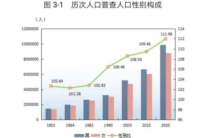 全市常住人口中,男性人口为986.60万人,占52.83%;女性人口为881.06万人,占47.17%。总人口性别比(以女性为100,男性对女性的比例)由2010年第六次全国人口普查的109.46上升为111.98。