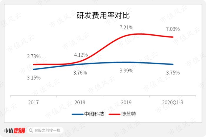 研发费用率方面,同期可比公司博蓝特的研发费用率分别为3.7%、4.1%、7.2%及7.0%,不仅持续高于公司同期研发费用率,并在2019年以后,与公司拉开差距。