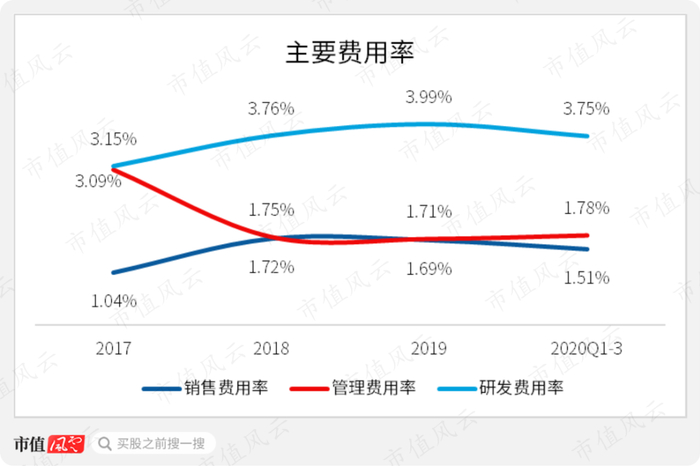 同期,公司的研发费用率有小幅提升,由2017年的3.2%提高至2019年的4%,2020年前三季度为3.8%,整体提高了0.6个百分点。