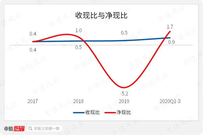 公司营收的现金含量整体较低,2017-2019年收现比分别为0.4、0.5及0.5,2020年前三季度回升至0.9,但仍然小于经验值1。