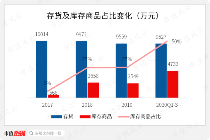 其中库存商品金额分别为568万元、2658万元、2549万元及4732万元,库存商品占比逐年攀升,由2017年的6%升至2019年的27%,2020年前三季度进一步飙升至50%。