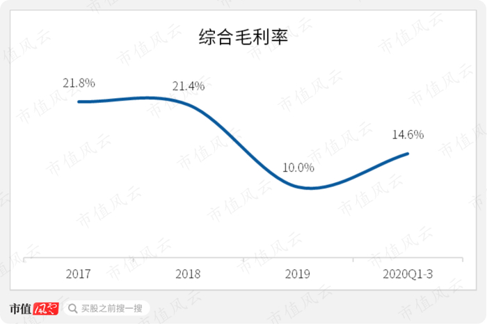 2017年以来,公司综合毛利率分别为22%、21%、10%及15%,整体呈现下降态势。