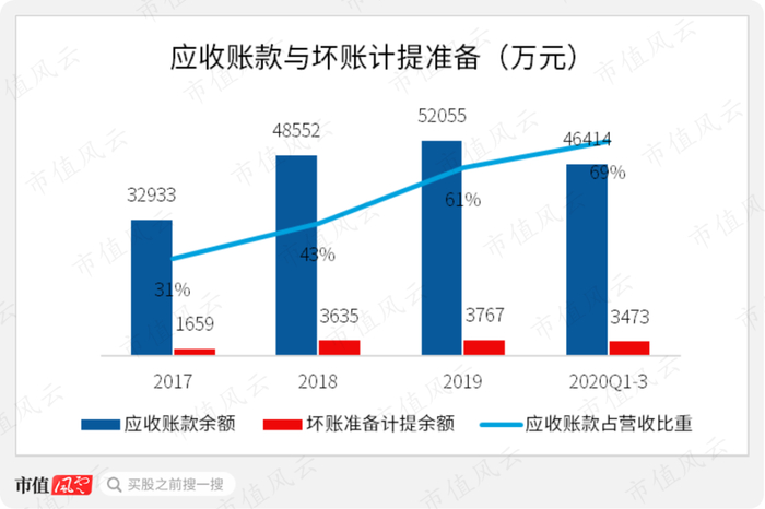 2017年以来,公司应收账款余额分别为3.3亿元、4.9亿元、5.2亿元及4.6亿元,占各期营业收入的比重分别为31%、43%、61%及69%,营收下滑的情况下,公司的应收账款却逆势增长。
