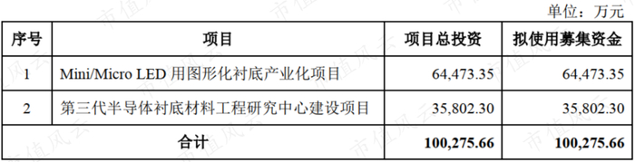 此次冲刺科创板,公司拟募集资金10亿元,其中6.4亿元用于Mini/Micro LED用图形化衬底产业化项目,3.6亿元用于第三代半导体衬底材料工程研究中心建设项目。