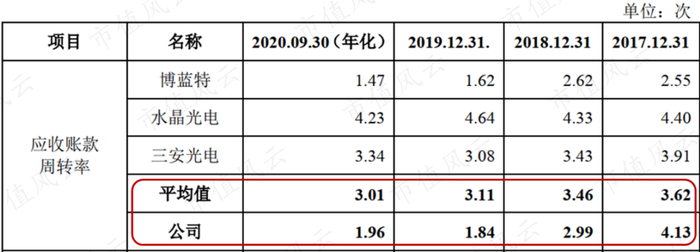 2017-2020年前三季度,公司的应收账款周转率分别为4.1次、3次、1.8次及2次,同行业可比公司平均值分别为3.6次、3.5次、3.1次及3次。
