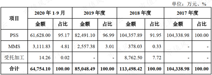 2017-19年及2020年前三季度(简称“2017年以来”),公司PSS产品营收占总营收的比重均在90%以上,2020年前三季度营收占比为95%;同期,MMS产品的营收占比较小,仅为5%。