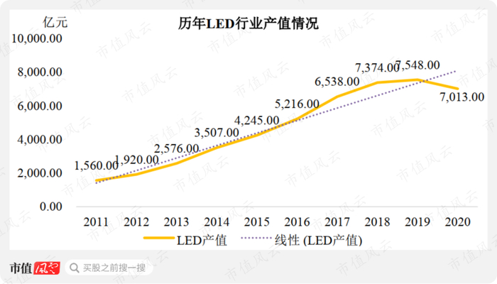 近年来,在国家政策的支持下,我国LED行业发展迅速,芯片企业积极扩产,行业产能大幅增长。2020年,我国LED行业产值为7013亿元,同比减少7%。