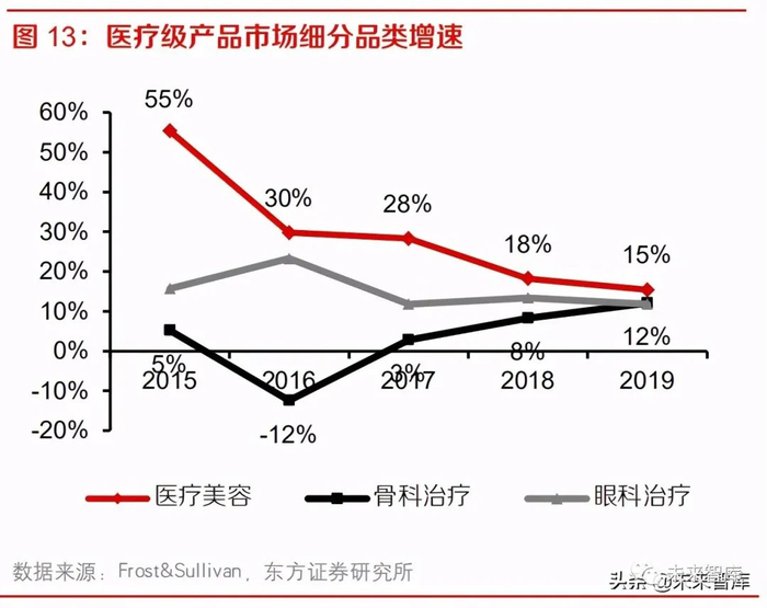 2019 年,国内医药级玻尿酸产品终端市场规模已达到 78.3 亿元,15-19 年复合增速为 14.7%。医 药级产品市场可进一步细分为医疗美容、骨科治疗和眼科治疗三个领域,2019 年占比分别为 55%、 22%和 23%,其中医疗美容在 15-19 年复合增速为 22.8%,明显快于骨科治疗(2.3%)和眼科治 疗(15%),医疗美容销售占比逐年提升,从 2015 年的 42%迅速增长至 2019 年的 55%。