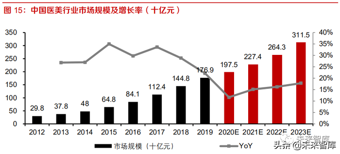 国内医美市场处于高速成长阶段。根据艾瑞咨询数据,2019 年,中国整形与医疗美容市场规模为 1,769 亿元,12-19 年复合增速为 29%,考虑到疫情影响,预计 2019-2023 年增速仍将突破 15%, 2023 年市场规模将达到 3,115 亿元。