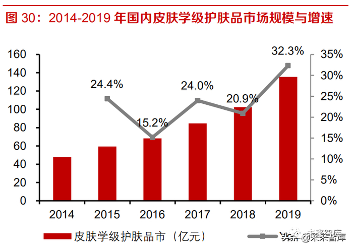 华熙生物的功能性护肤品板块(主打玻尿酸成分)也取得了高速发展,2014-2019 年复合增速为 114%。 根据前瞻产业数据,2019 年,中国皮肤学级护肤品市场规模为 135.51 亿元人民币,2014-2019 年 CAGR 达到 23.2%,增速远高于同期国内化妆品(9.9%)以及护肤品行业(10.1%)的复合增速。但从渗透率来看,中国市场 2019 年仅为 5.5%,和发达国家相比也有较大空间。