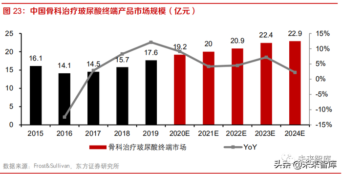在骨科领域,玻尿酸可用于治疗骨关节疾病、骨折固定术、关节僵硬症以及腰间摘除术注射等治 疗。临床上,关节腔内注射高分子透明质酸被广泛应用于骨关节炎治疗,达到润滑关节,促进骨质 修复、延长部分患者疼痛缓解时间的作用。根据 Frost&Sullivan 数据,2019 年中国骨科治疗玻尿酸终端产品市场规模为 17.6 亿元,预计 2019- 2024E 复合增速为 5.4%。