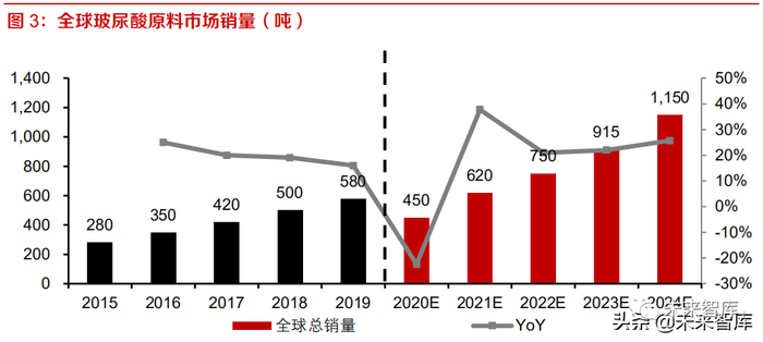 全球玻尿酸原料市场景气度高,预计 2019-2024E 复合增速为 14.7%。根据 Frost&Sullivan 数据, 2019 年,全球透明质酸原料市场销量达到 580 吨,2014-2019 复合增速约为 20%,增长的驱动力 主要为下游应用行业的需求大幅增长、以及透明质酸制造工艺的不断突破。展望未来,2019-2024E 年行业的复合增速预计为 14.7%,在 2024 年达到 1,150 吨的市场销量。