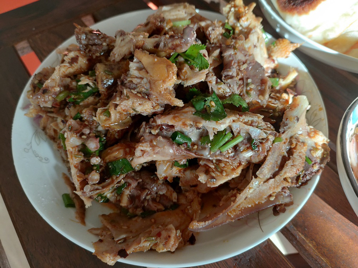 拌鸡架也是在沈阳常见的一种吃法。鸡架是事先卤过的,用手轻轻一掰,鸡架就散了,装在盆儿里,加葱花、香菜和辣椒油,拌拌就是一份啦。有的店不光有拌鸡架,还有拌鸡腿,老大一个鸡腿才5块,吃的时候多放点辣椒,那种味道绝了啊。