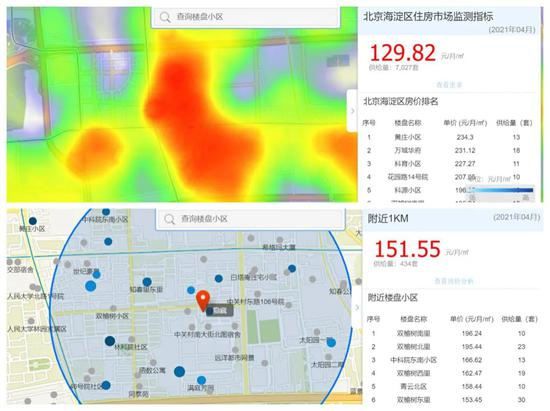 图/中关村租房热度图(上);中航广场附近1千米房租分布图(下)