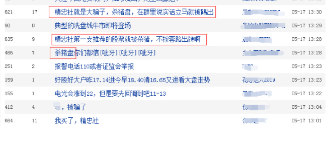 股吧里有股友表示:“精忠社就是大骗子,杀猪盘,在群里说实话立马就被踢出”。也有网友表示:“精忠社第一支推荐的股票就被杀猪,不按套路出牌啊”。