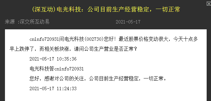 电光科技这几天波动较大。有投资者在深交所互动易上询问该公司生产营业是否正常?电光科技回应称,公司目前生产经营稳定,一切正常。