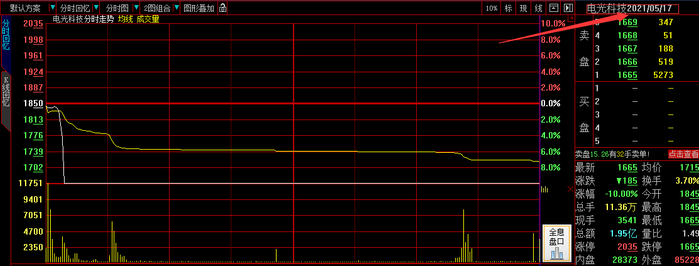 5月18日,电光科技开盘仅4分钟就突发闪崩,3分钟就被按在了跌停板上。截至发稿报14.99元/股,跌9.97%,跌停板上仍有超6万手封单。