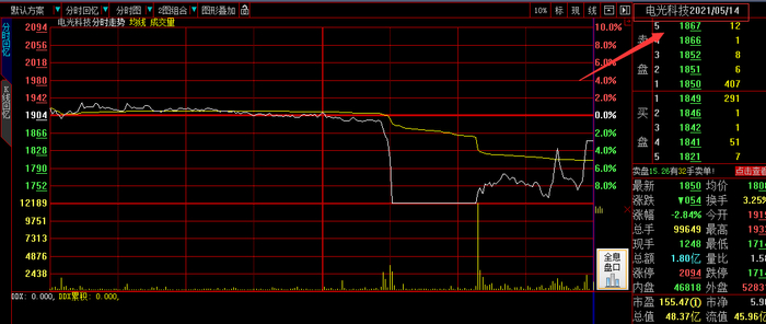 值得注意的是,最近几天,电光科技的走势都非常诡异,5月14日、5月17日也都出现了闪崩行情。