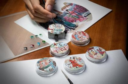 中国传统古瓷工艺要求匠人们必须拥有熟练的技能与持久的耐心,耗时极长的干燥和超高温反复烧制,使釉质玻化并呈现半透明状,赋予表盘通透的温润如玉的完美光泽。而微绘珐琅作为西方珐琅最高工艺代表,工匠用极其精细的画笔手工绘制,在图案轮廓完成后,将珐琅粉末加热至无色,在其中加入“机密配方”以获取所需颜色,再用特制的超细画笔和高倍显微镜镜放大表盘,经过数月手绘制完成。1200摄氏度烈火高温烧制,为表盘釉彩固色的效果,直至发出夺目的光彩,得以逃脱时间法则,永不褪色。但如此高温的烧制,对于普通金质基座的珐琅表盘来说,难度极高,几乎不可能完成。宝珀所使用的古瓷工艺,无疑为表盘的颜色及强度开拓了全新的可能性。