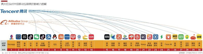 如果取苹果应用商店中国区免费APP排行榜前30名(2021年5月9日数据)来观察,有18款都与腾讯或阿里存在直接或间接资本联系,比例超50%,足见这两大巨头对中国移动互联网的影响力。现在巨头的资本触角已经伸到了线下。中国快递业的“三通一达”(中通、圆通、申通、韵达),再加上百世快递,都接受了阿里巴巴的投资。