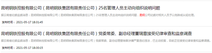 与此同时,云南省纪委监委还发布消息称,昆明钢铁控股有限公司25名管理人员主动向组织说明问题,昆钢公司纪委对相关人员予以免除或从轻处理。
