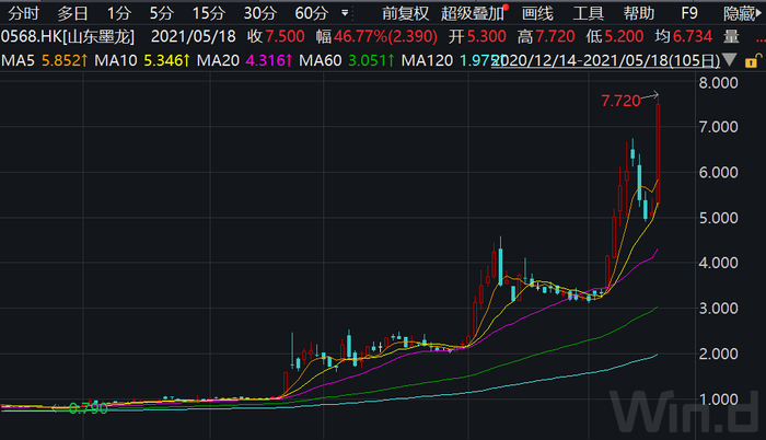 Wind数据显示,今年2月以来,截至5月18日,山东墨龙A股股价累计涨幅达112.37%。