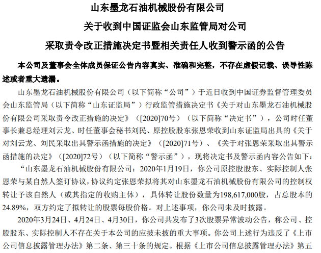 山东墨龙2020年12月8日公告,2020年1月19日,公司原控股股东、实际控制人张恩荣与某自然人签订协议。协议约定,张恩荣拟将其对山东墨龙的控制权转让予该自然人(或其指定的收购主体),具体转让股份数量为1.99亿股,占总股本的24.89%,双方约定了拟转让的股票每股价格。对上述事项,山东墨龙未及时披露。同年3月24日、4月24日、4月30日,山东墨龙共发布了3次股票异常波动公告,称公司、控股股东、实际控制人不存在关于公司的应披未披的重大事项。