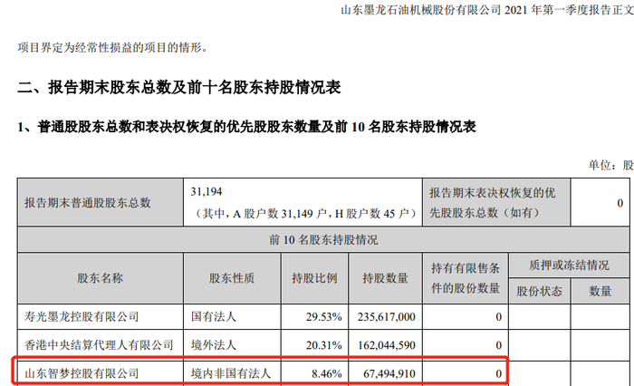 山东墨龙2021年一季报显示,截至3月末,公司第一大股东为墨龙控股,持股比例29.53%;第二大股东为香港中央结算代理人有限公司,持股比例20.31%;智梦控股为第三大股东,持股比例为8.46%。