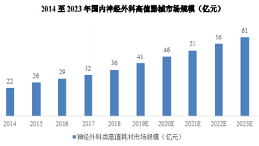 在神经外科类高值耗材市场领域,改革开放以来,随着国外先进影像设备的引进,神经外科进入了高速发展时期,应用于神经外科的高值耗材市场规模也随之快速增长。以出厂价计算,2018 年我国神经外科高值耗材市场规模约为36亿元,较 2014 年复合增长率达到13.10%。未来,受益于国内神经外科手术技术的不断成熟、神经外科科室力量的增强和医生数量的增长、神经外科手术向三四线城市和基层医院下沉,以及人们支付能力上升和健康意识加强带来的神经外科手术需求的进一步释放,预计神经外科高值器械市场规模将保持持续增长。根据南方所数据,2023 年我国神经外科高值耗材市场规模预计将达到 61 亿元,2018-2023 年复合增长率将达到 11.12%。