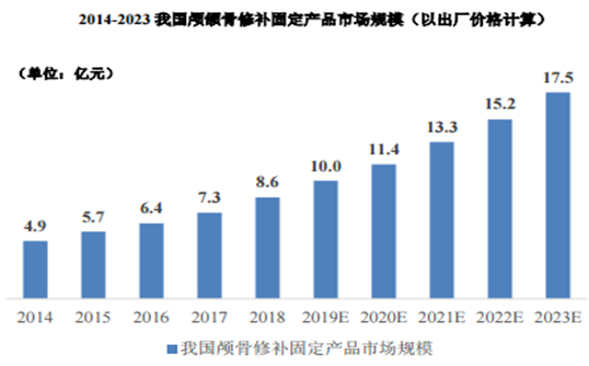 根据南方所数据,2017年至2019 年我国PEEK 颅骨修补产品市场规模复合增长率超过80%,2023年我国颅颌骨修补固定产品市场规模将达到 17.5 亿元,2018年至2023年的复合增长率为 15.3%。这将给康拓医疗未来的发展带来较大的发展空间。