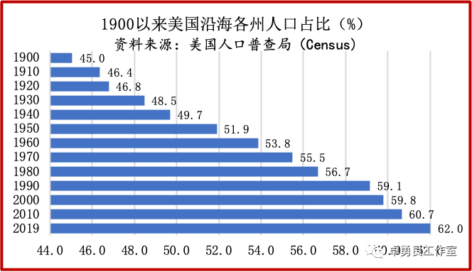 美国和日本人口向沿海地区集聚的趋势,至今仍在持续。1900年,美国24个沿海州的人口占美国45.0%,2019年占62.0%,上升17.0个点。