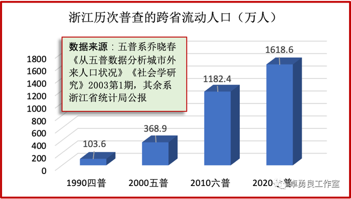 1990年以来,浙江经济增速较大放慢,人口增长反而加快。1990至2000年,浙江GDP年均增长15.0%;2000至2010年12.4%;2010至2020年7.3%。浙江人口增长加快,五普12.2‰,六普15.3%,七普17.2%。虽然可以笼统说,经济较快增长是浙江人口较快增长的基本原因。但具体言,浙江人口增长另有更深刻的原因。