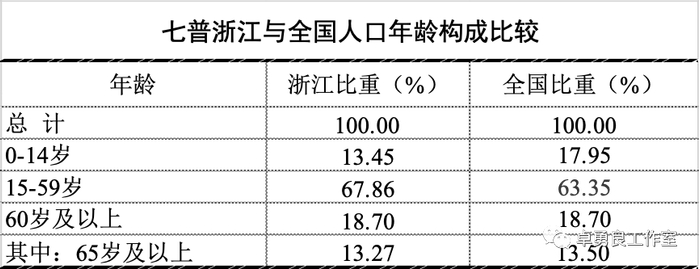 浙江人口的年龄结构具有“孩子少、劳动年龄人口多,老年人也多”的特点。全省0-14岁人口占13.45%,比全国低4.50个点;15-59岁人口占67.86%,比全国高4.51个点;60岁及以上老人占比与全国相同。