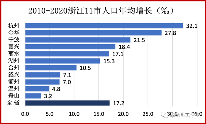 浙江人口增长大大快于经济增长,这是以全国平均数为基准的结论。2010至2020年,浙江人口年均增长17.2‰,是全国人口年均增长5.3‰的3.2倍。同期,浙江GDP年均增长7.4%,是全国GDP年均增长6.8%的1.1倍。